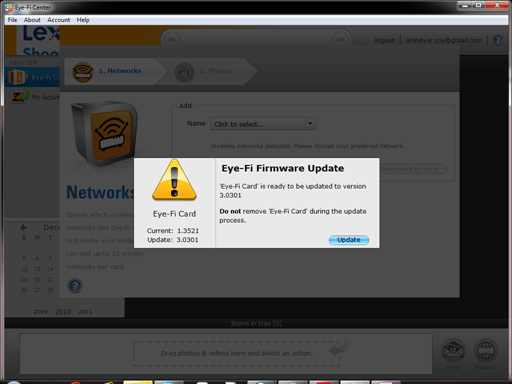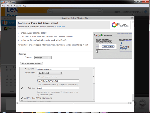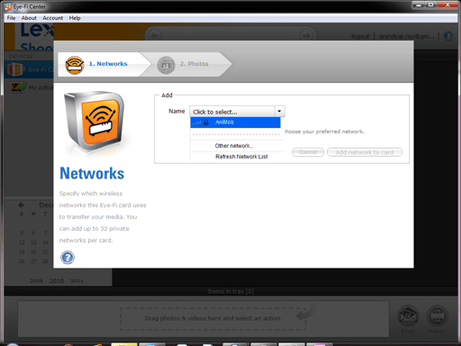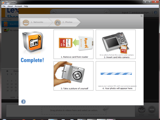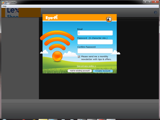 Step 1: Install the Eye-Fi Center from the internet and register yourself. For this you have to insert the card to the machine from where you are running the Eye-Fi Center application. The software should automatically detect that it’s a new card and present you the registration page instead of the login page