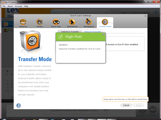 Step 11: enable relayed transfer if you want the online update to happen independently without the intervention of the PC running Eye-Fi Center. If its not enabled, then the online transfer will only happen via the PC running Eye-Fi center application.