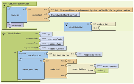 In this application, the Android events, APIs, conditions, and functions are pre created and arranged as blocks of jigsaw puzzle, in such a way that only logically correct block can fit to the other block. See below the screenshot of making such a simple applications to get stock quotes from Yahoo Finance