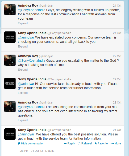 You can find the complete communication between me and Sony Xperia India here. https://twitter.com/SonyXperiaIndia/status/393285453182275585
